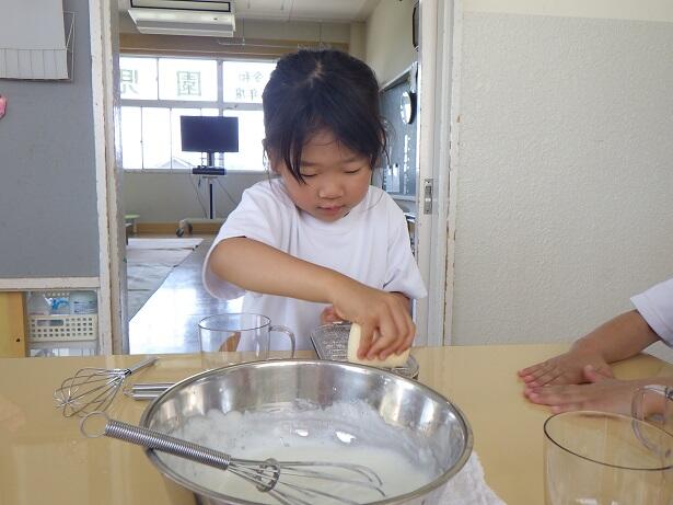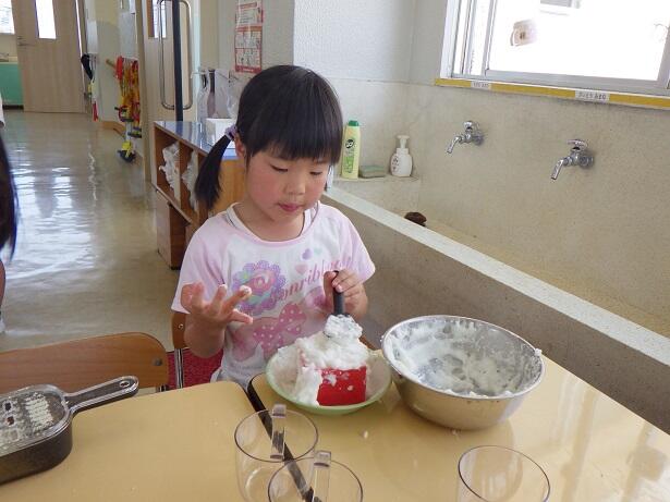 年長で、石鹸を削った粉を泡立てたものを、容器に重ねてケーキを作ってみました。