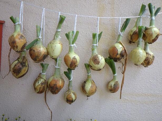 残ったタマネギは、玄関の脇に2つずつ束ねて干しました。