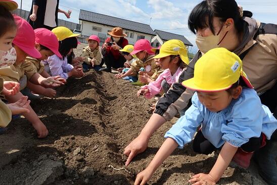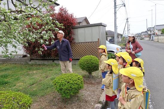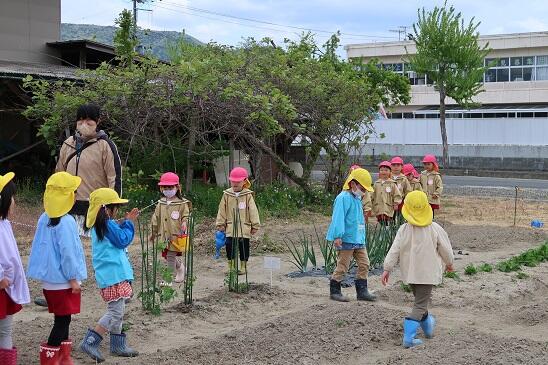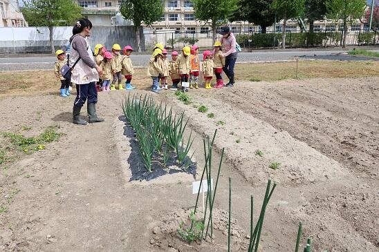 4月17日(月)年長児が年少児を連れて、かがやきファーム(園畑)を案内しました。広い広いかがやきファームに、年少児もびっくりしていました。これからここでいろいろな野菜を育てていきます。楽しみですね。