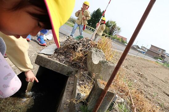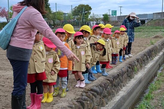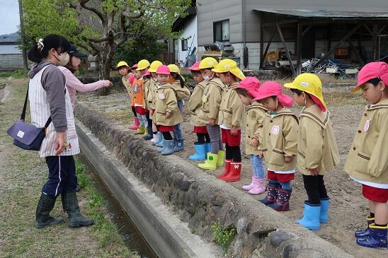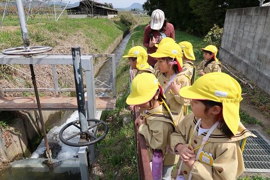 年長児は、かがやきファームの脇を流れる用水路の水をみて、「この水どこから来るの?」と疑問を持ち、用水路の流れてくる水をたどってみることになりました。