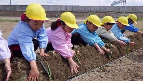 今日はみんなでネギを植えました。子どもたちは、味噌汁に入れたいとか、納豆に混ぜて食べたいなど、ネギの生長を今から楽しみにしています。