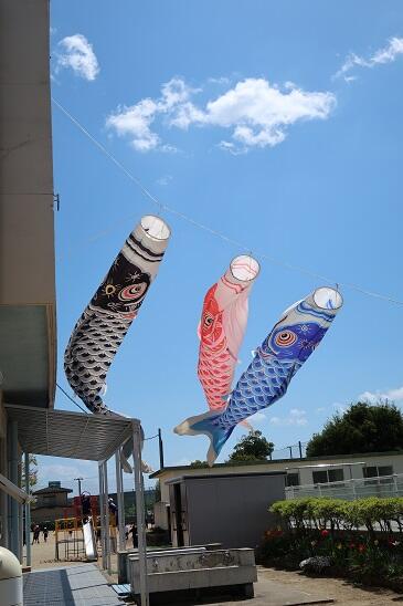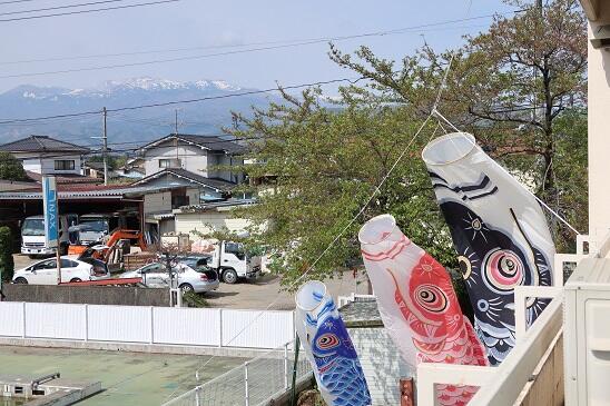 園舎の2階、吾妻山を望みながら気持ちよさそうに、鯉のぼりが泳いでいます。