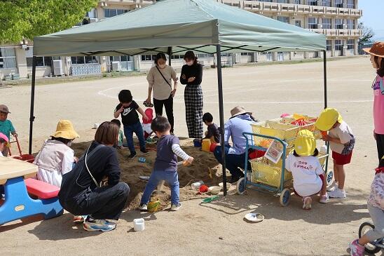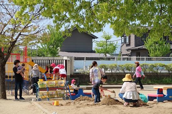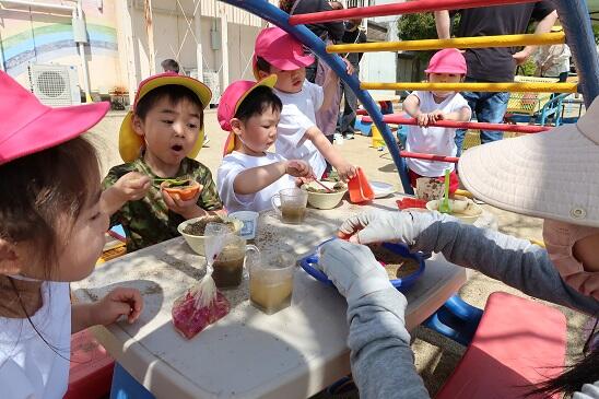今日は、年長たけのこ組、年少つくし組に、未就園児ぱんだ組、合わせると30人近くの子どもたちで園庭は活気に満ちていました。