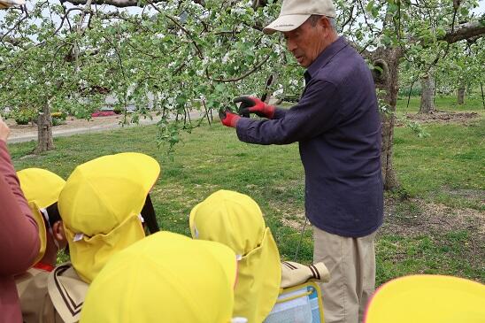 りんごの花に受粉をしたり、実選りをしたりしている近所のおじさんに会い、美味しいりんごの作り方を教えていただきました。