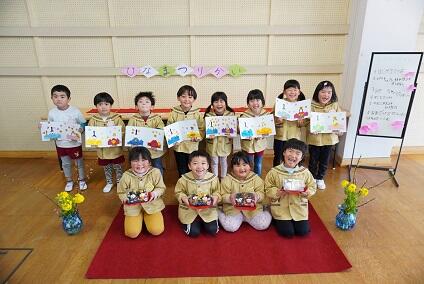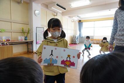 ひな祭りの歌を歌い、園長先生のお話の後、おひな祭りのパネルシアターを聞きました。