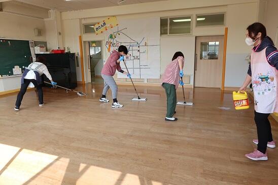 保護者の皆様には、教室などの清掃・ワックスがけの環境整備をしていただきました。