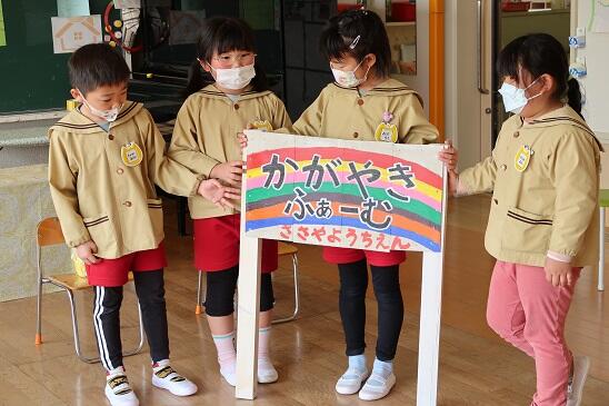 年長さんから年少さんに、かがやきファーム(園畑)の新しい看板のプレゼントです。年長さんの手作りです。