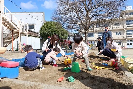 今日は天気が良いので、最初は楽しく外で砂遊びです。