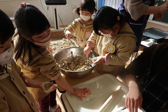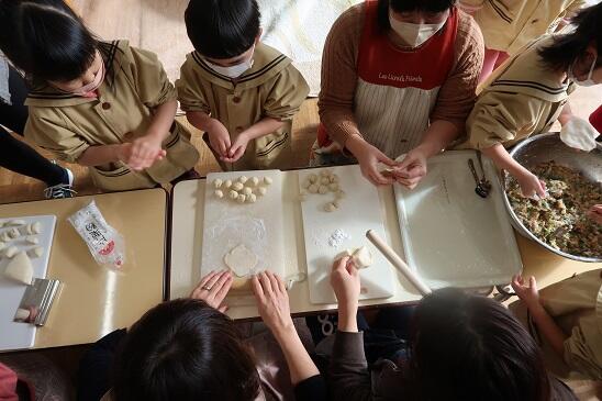 餃子の皮を丸く伸ばし、餡を餃子の皮で包んで、餃子は完成です。みんなで手分けして作っています。子どもたちは結構上手ですね。