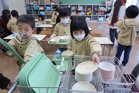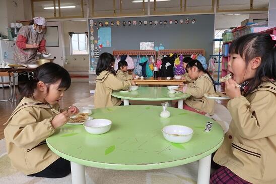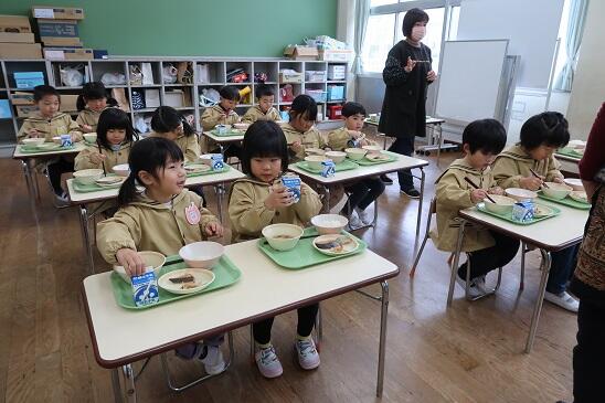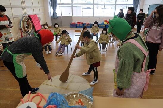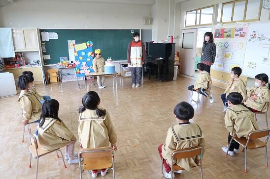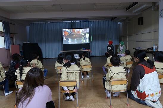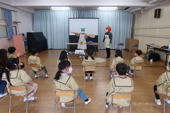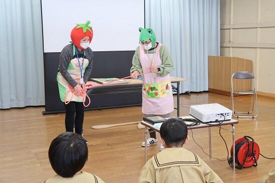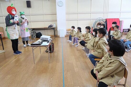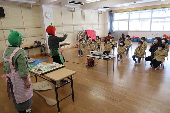 1月27日(金)の午後、いつも給食試食会でお世話になっている、北部学校給食センターの本田先生と渡邉先生を講師にお招きし、園児向けの栄養教室を行いました。
