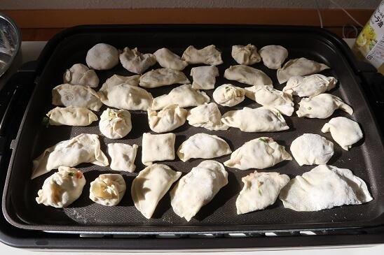 出来上がった餃子は、ホットプレートで蒸し焼きです。大きさがいろいろなのがいいですね。