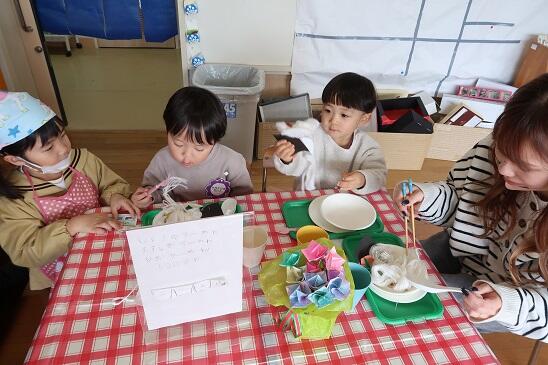 年少児のラーメン屋さんとピザ屋さんのお客さんになり楽しみました。