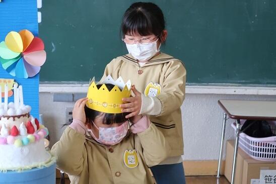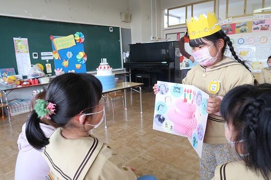 お誕生日の冠をかぶせてもらい、プレゼントを渡しました。