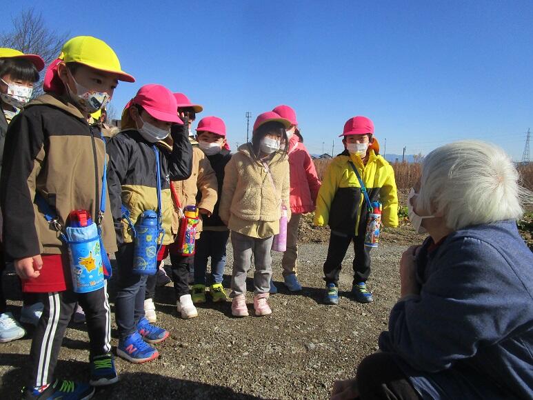 帰りは、トイレ休憩のため信陵学習センターに立ち寄り、卒園式でお世話になる館長さんにご挨拶してきました。その後、畑作りで大変お世話になっている守谷さんに、守谷さんの畑で会いました。