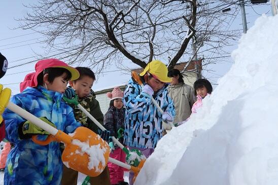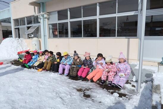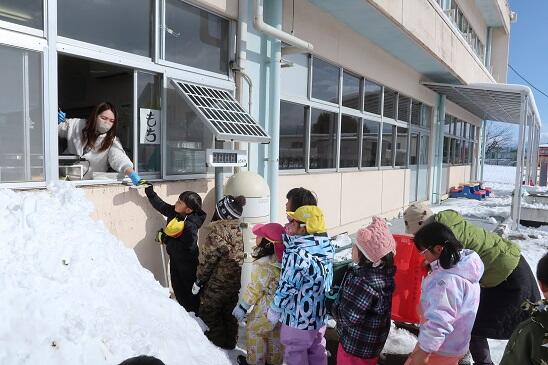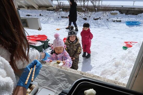 「一生懸命かまくら作りした子どもにのり餅あるよー」