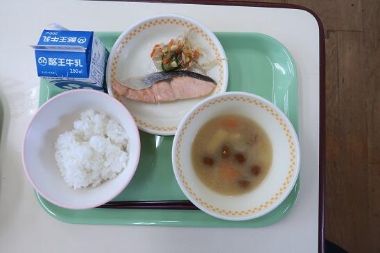 今日の献立は、ご飯になめこ汁、さけ塩焼き、ごぼうサラダ、そして牛乳です。