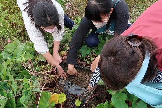 畑のサツマイモの出来具合を確認するために、先生たちでためしに掘ってみました。