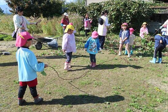 さつまいも掘りを終わったあと、さつまいものツルで遊んだよ。