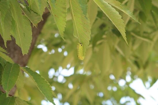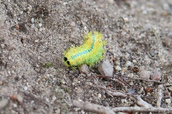 イラガの幼虫は、通常は8月頃に見られ、体長は25mm位、脚が短くずんぐりした体に多くの棘を持ち、触れるとハチに刺されたような鋭い痛みがあるので触らないように注意が必要です。
