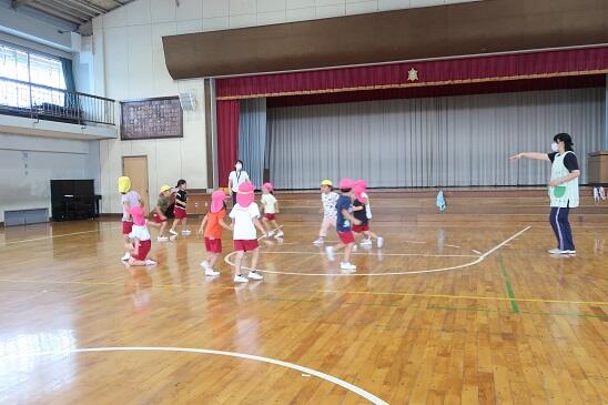 年少つくし組と年長たけのこ組一緒に、広い小学校の体育館で手つなぎ鬼をしました。
