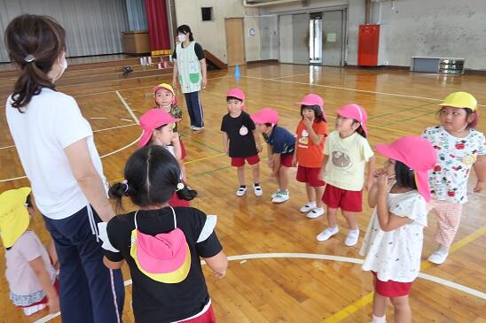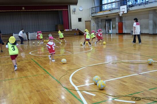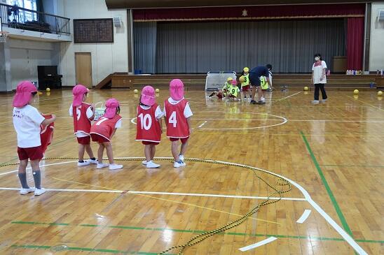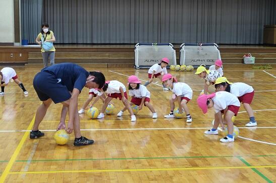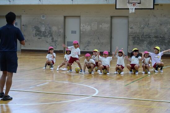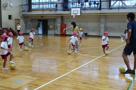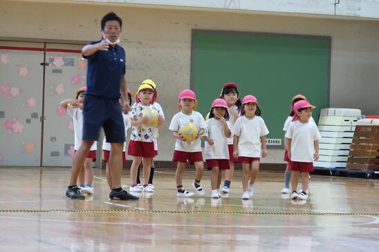 9月8日(木)のお昼の時間に、小学校の体育館で、今年度2回目のサッカー教室を開きました。1回目と同様、園児たちの大好きな、なべちゃんコーチに教えていただきました。