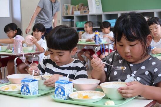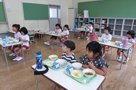 まるで小学生です。園児は小学校での給食試食会をいつも楽しみにしています。