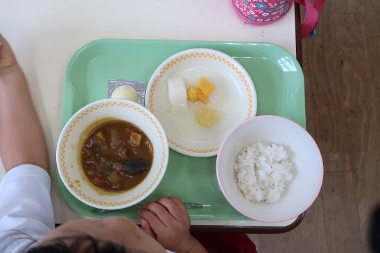 今日のメニューは、夏野菜のカレーライス(ライスは麦ご飯)、フルーツ杏仁、動物チーズと牛乳です。
