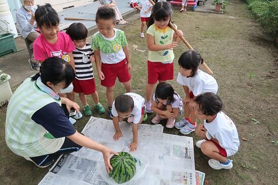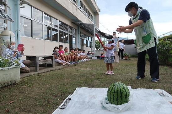 全員スイカ割りに挑戦しましたが、スイカは割れません。どうしようかな?