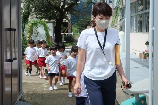 園児は、緊急放送を静かに聞き、先生と一緒に安全に避難をしました。