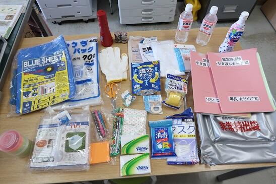 避難訓練に合わせて、避難時に携帯する「非常持出袋」の点検もしました。非常持出袋には、緊急時に慌てないように、下の写真のものを入れてあります。