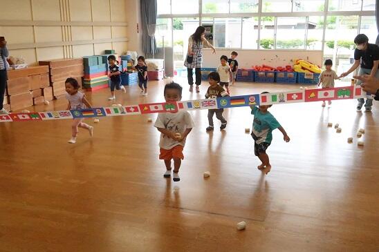 今回は遊戯室で、10月1日(土)の運動会で行う就園児種目の練習も兼ねた遊びもしました。