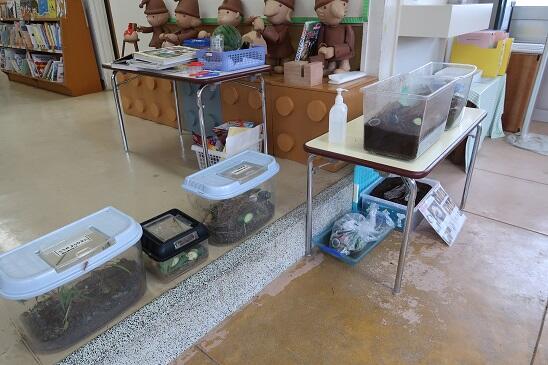 玄関の昆虫園には、たくさんの園児が世話している虫がいます。