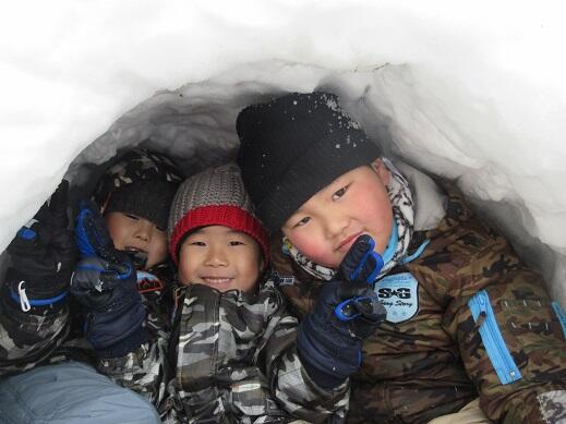 年長組さんは、かまくらを作っています。かまくらを知らないお友達も、知っているお友達に教えてもらいながら一生懸命作りました。