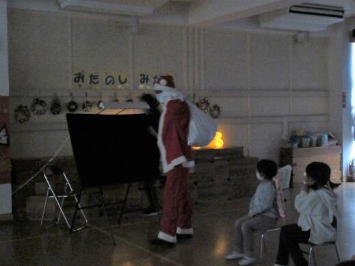 お楽しみ会の途中、鈴の音が聞こえてきて、なんとサンタさんが来てくれました!