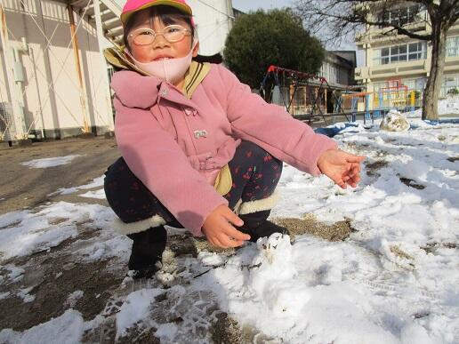今年度初めて雪が積もり、年少組では雪遊びをしました。