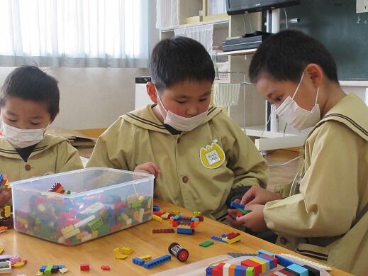 預かり保育では、ブロック遊びやパズル、ビーズ遊びなど、自分の好きな遊びを選んで遊ぶ時間があります。