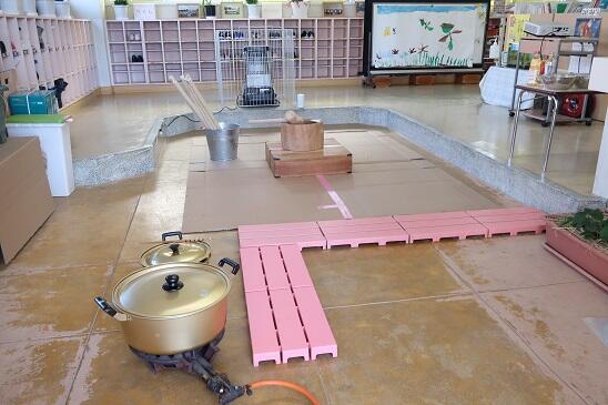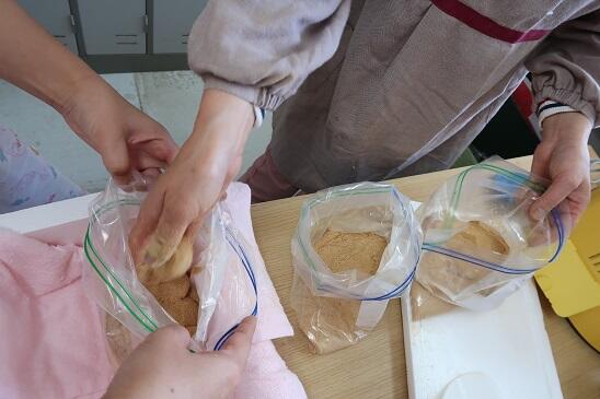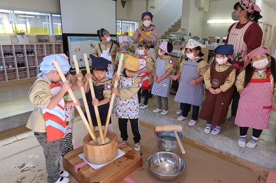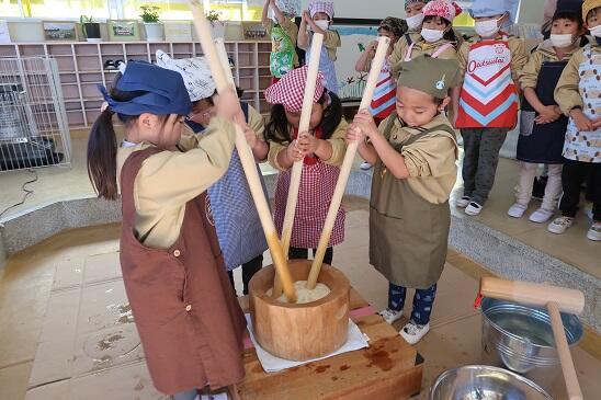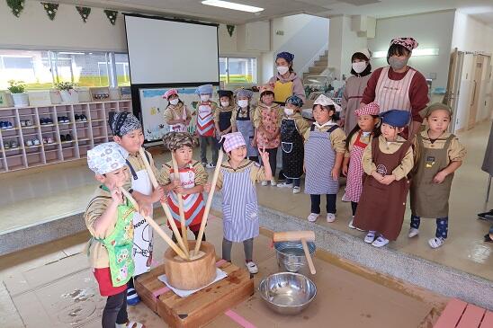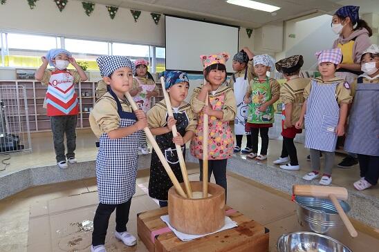 年長児がハシドラッグでお買い物したもちつき会の食材や、年少児が園で煎って割って取り出しクルミを使ったりして、みんなで準備してきました。