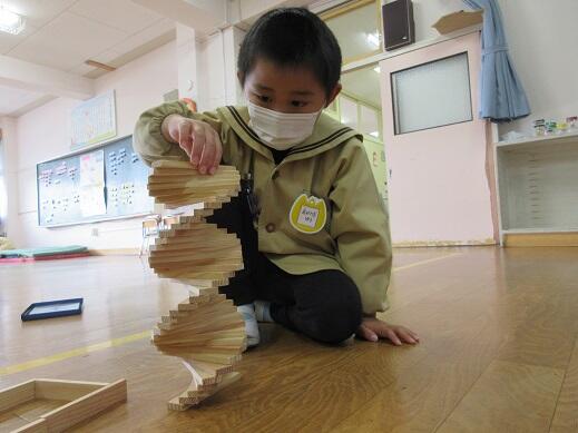 らせん状に積み上げるには、積み木の角度など絶妙なバランスが必要なようでした。
