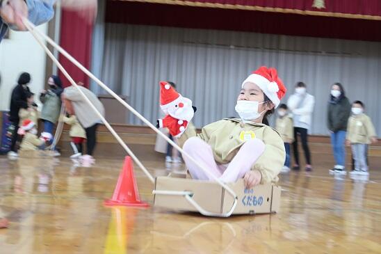 サンタクロースになって、そりに乗ってリレーです。おうちの人が引いています。
