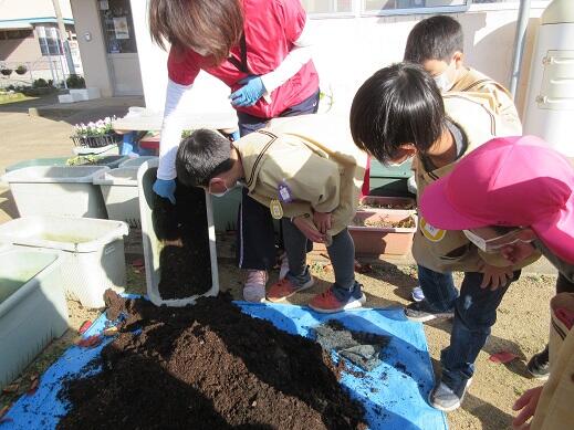土を入れ替えるために、プランターをひっくり返すと、土の中にたくさんの白い幼虫がいました。園児たちは大喜びです。