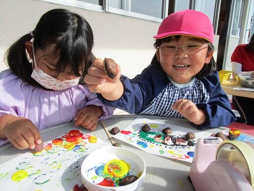 スタンプの土台は、切ったさつまいもやクルミの殻です。