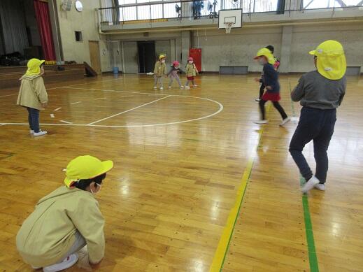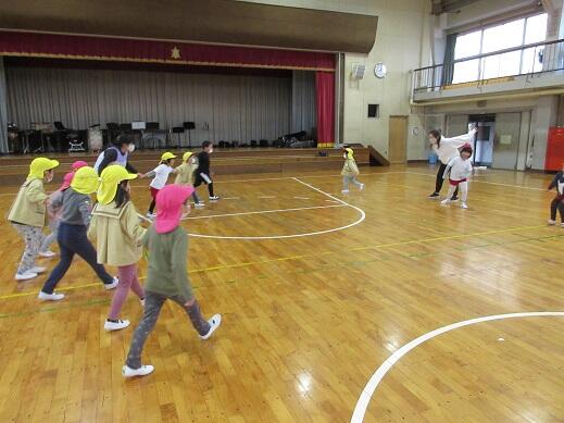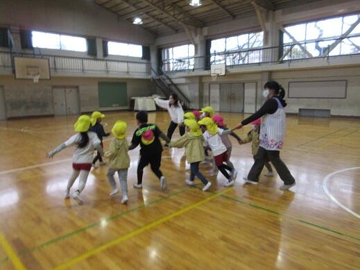 笹谷小学校の体育館でみんなで手つなぎ鬼をして遊びました。