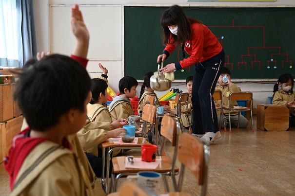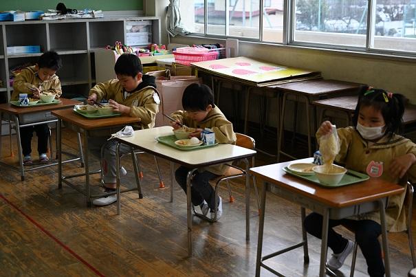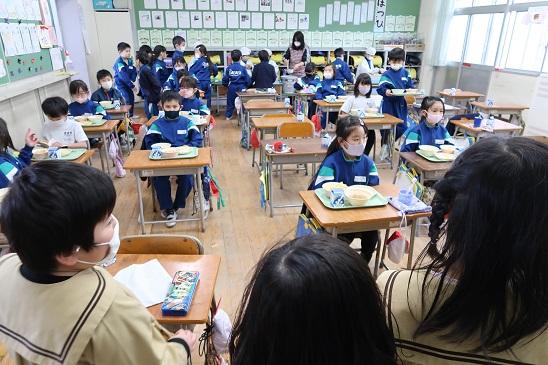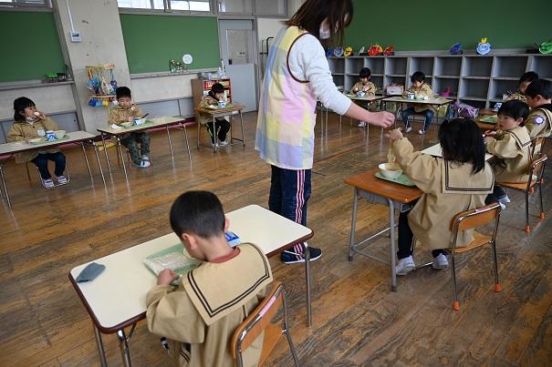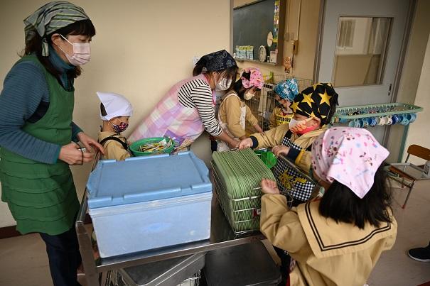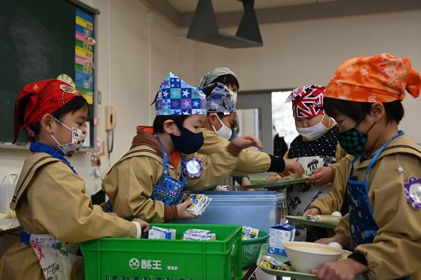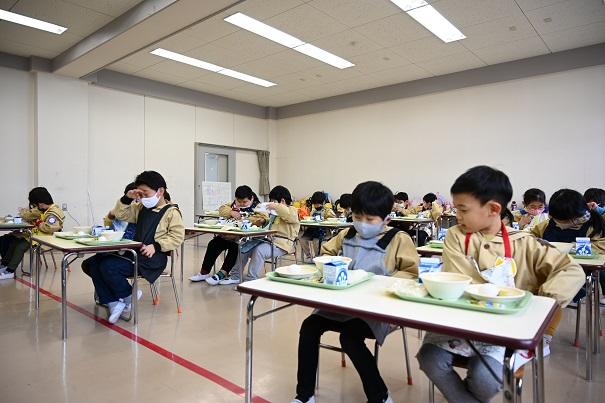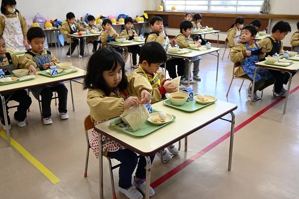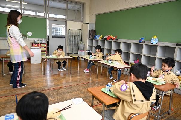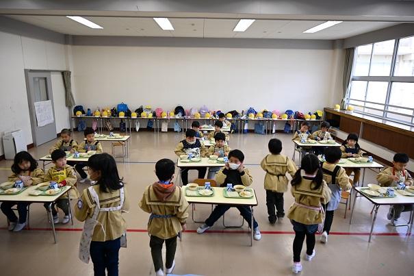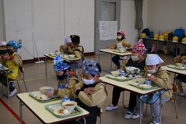 園児全員で、小学校の給食を試食させていただきました。今年は、新型コロナウイルス感染症拡大防止のため、小学生との交流はありません。