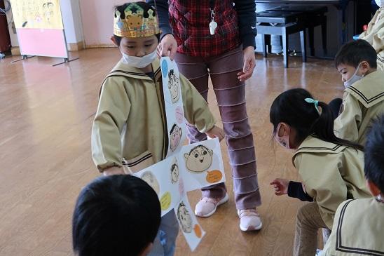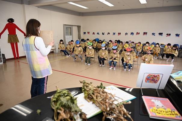 園長先生の挨拶に続いて、愛果先生にひな祭りの紙芝居をしていただきました。園児たちは、興味深く話に聞き入っていました。