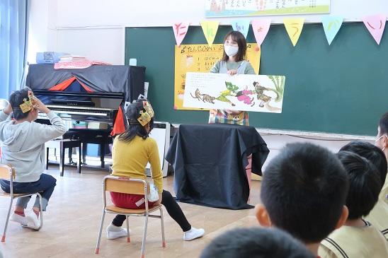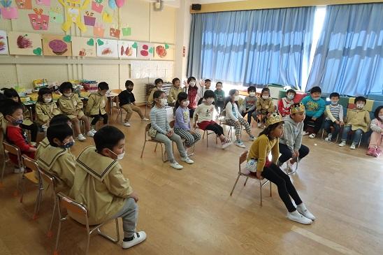 今日のお楽しみは、愛果先生の大型絵本の読み聞かせです。