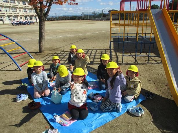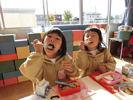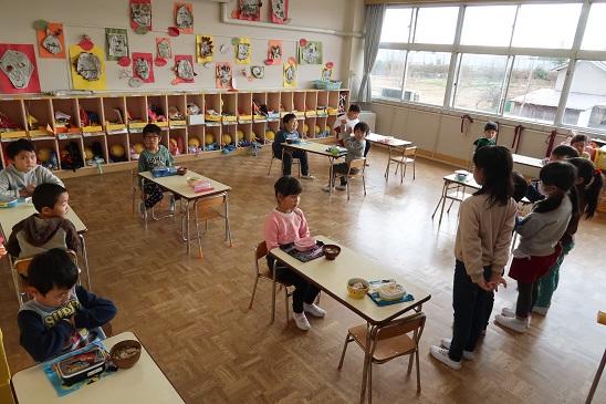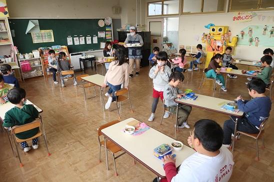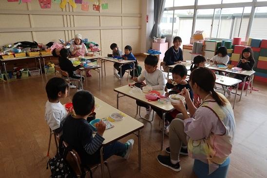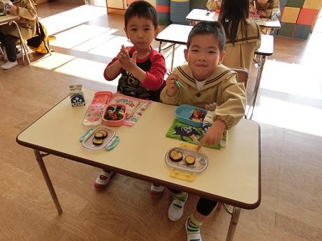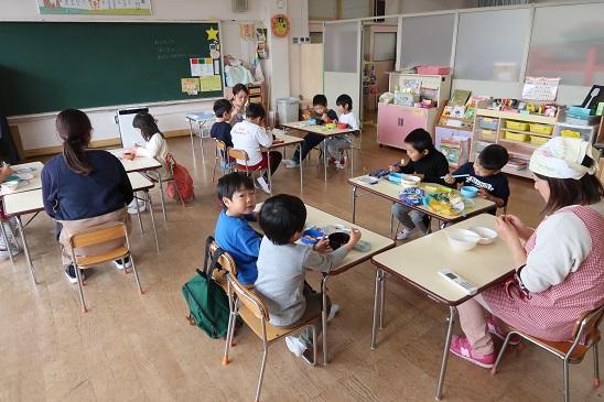 感染拡大防止のため年長たけのこ組、年少つくし組は別々に教室で会食です。