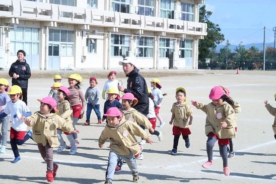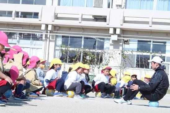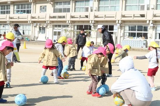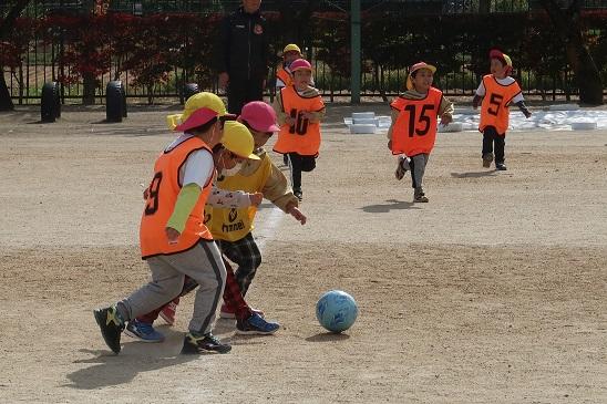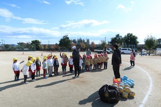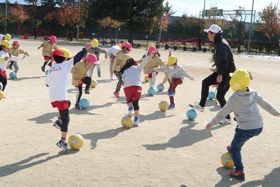 10月30日(金)笹谷小学校校庭で、県サッカー協会キッズ委員会県北地区が開催する「サッカー教室①」を行いました。2名の講師の先生が来園して園児たちと楽しくサッカーをして遊びました。