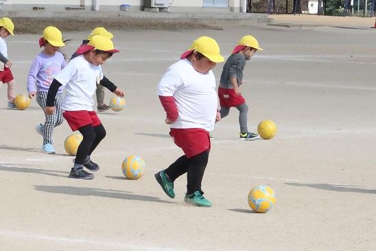 いよいよ、足とボールがお友達になることです。さすが、笹谷幼稚園児、上手にドリブルできていますね。