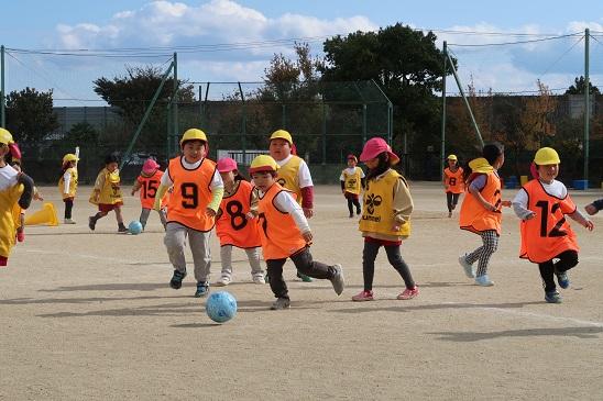 いよいよ、サッカーの試合です。赤チームと黄色チームに分かれて、どれだけ相手のカラーコーンにぶつけられるかを競いました。園児たちはビブスを着て楽しく試合に取り組んでいました。