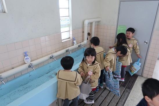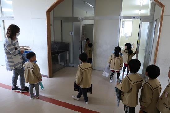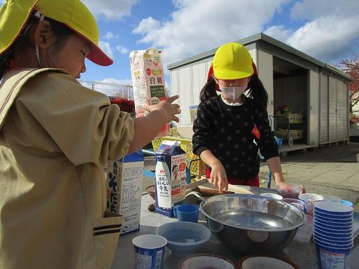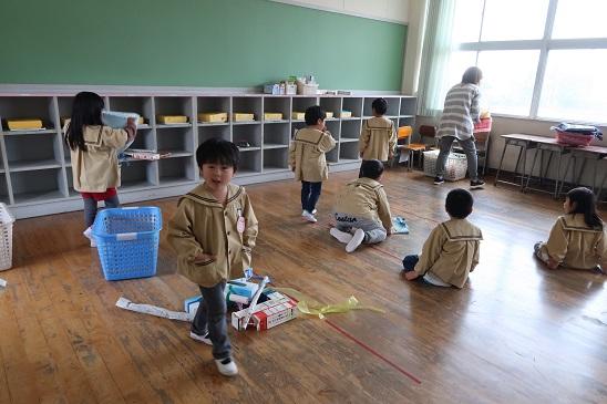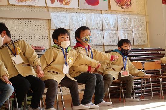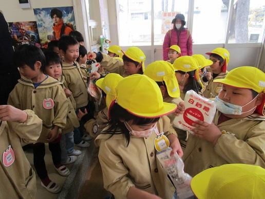 幼稚園に戻ったら、年少さんがお帰りなさいと待っていました。年少さんに、餅つき会のために買ってきたものを説明しました。